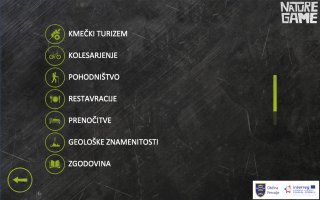 Nature Game mobilna aplikacija na Android touch TV-u, info slika na stacionarnoj lokaciji u Prevalju, slanje bodova na e-mail, pretraživanje atrakcija u blizini prema lokaciji, itd...